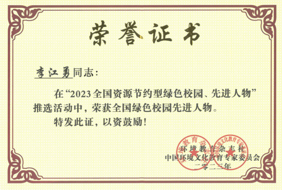 近日,在由中國環境文化教育專家委員會、生態環境部主管的《環境教育》雜志社共同開展的“2023全國資源節約型綠色校園、先進人物”推選活動中,我校被評為“全國資源節約型綠色校園”,后勤處(集團)李江勇同志被評為“全國綠色校園先進人物”。