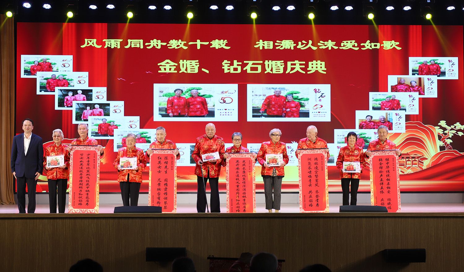 學校今年共有鉆石婚夫婦14對、金婚夫婦9對。聯歡會上,任旭東向鉆石婚和金婚夫婦代表贈送了嵌名楹聯和水晶紀念照。