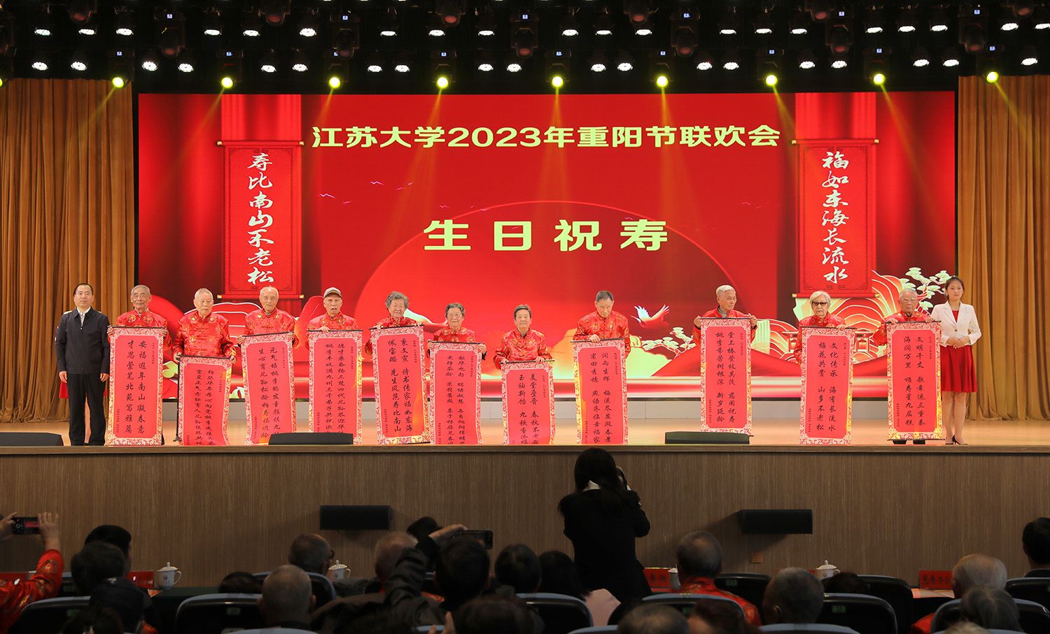 學校今年共有172位整生日壽星,其中90歲的壽星有42位。在聯歡會生日祝壽儀式上,楊敬江向90歲壽星代表贈送了祝壽禮品和祝壽楹聯。