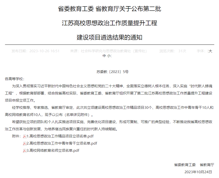 2個項目入選第二批江蘇高校思想政治工作質(zhì)量提升工程建設項目