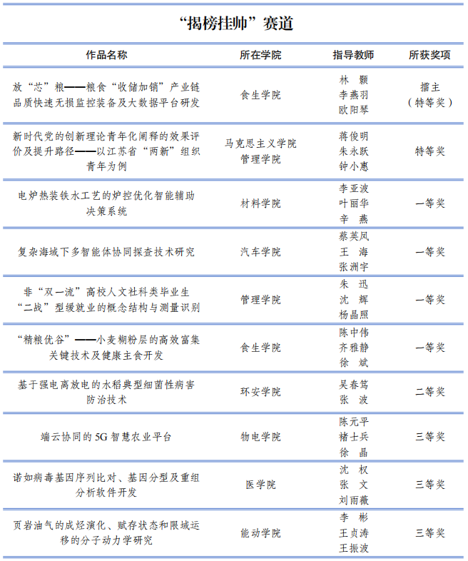 2021年12月,學校啟動第十八屆“挑戰杯”作品征集,共有409件作品、3987名同學參與,經過專家評審,33件作品在校內賽中脫穎而出,11項作品入圍江蘇省賽并攬獲特等獎7項。按照全國賽競賽規則,學校專項研究,選送了6件作品參加全國賽網評,最終4件作品入圍全國終審決賽現場。此外,兩件“揭榜掛帥”作品入圍全國擂臺賽現場。(校團委)