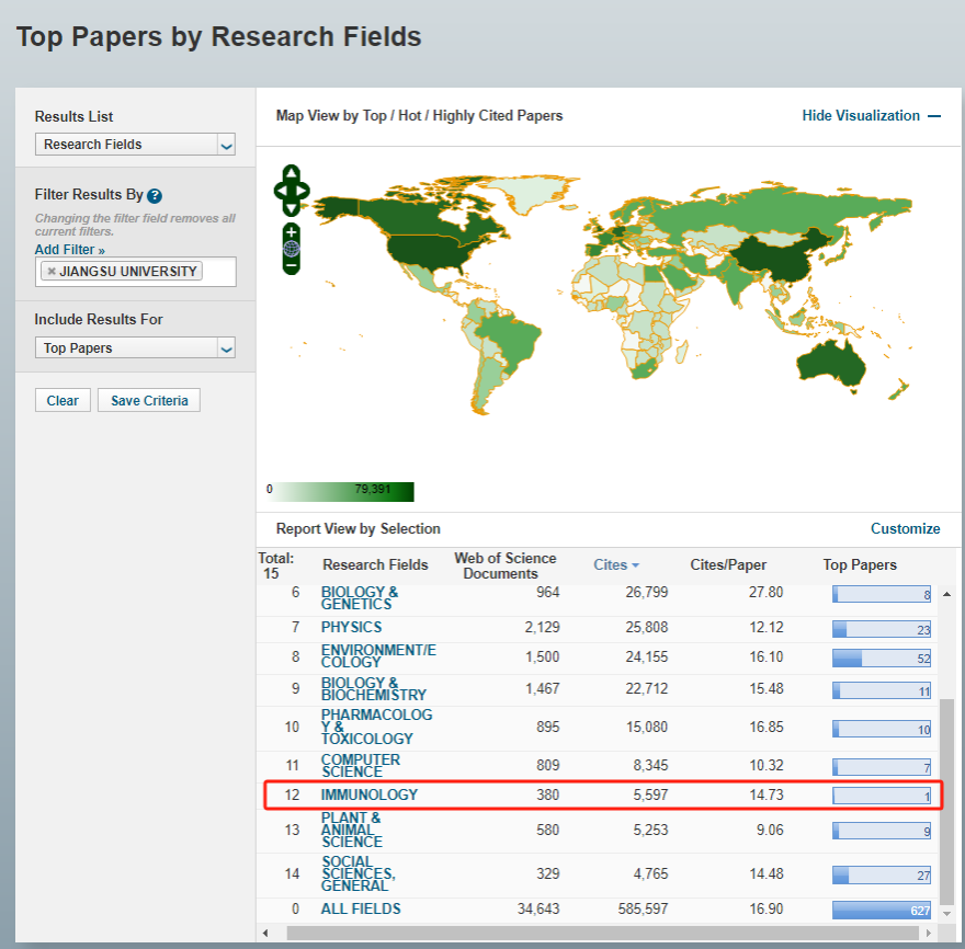 近日,科睿唯安發布了最新ESI數據,全球共有8917家科研機構上榜,其中包含432所中國內地高校。數據顯示,江蘇大學免疫學學科首次進入ESI全球排名前1%。截至目前,我校進入ESI全球前1%的學科數達14個,其中工程學、化學、農業科學3個學科排名前1‰。