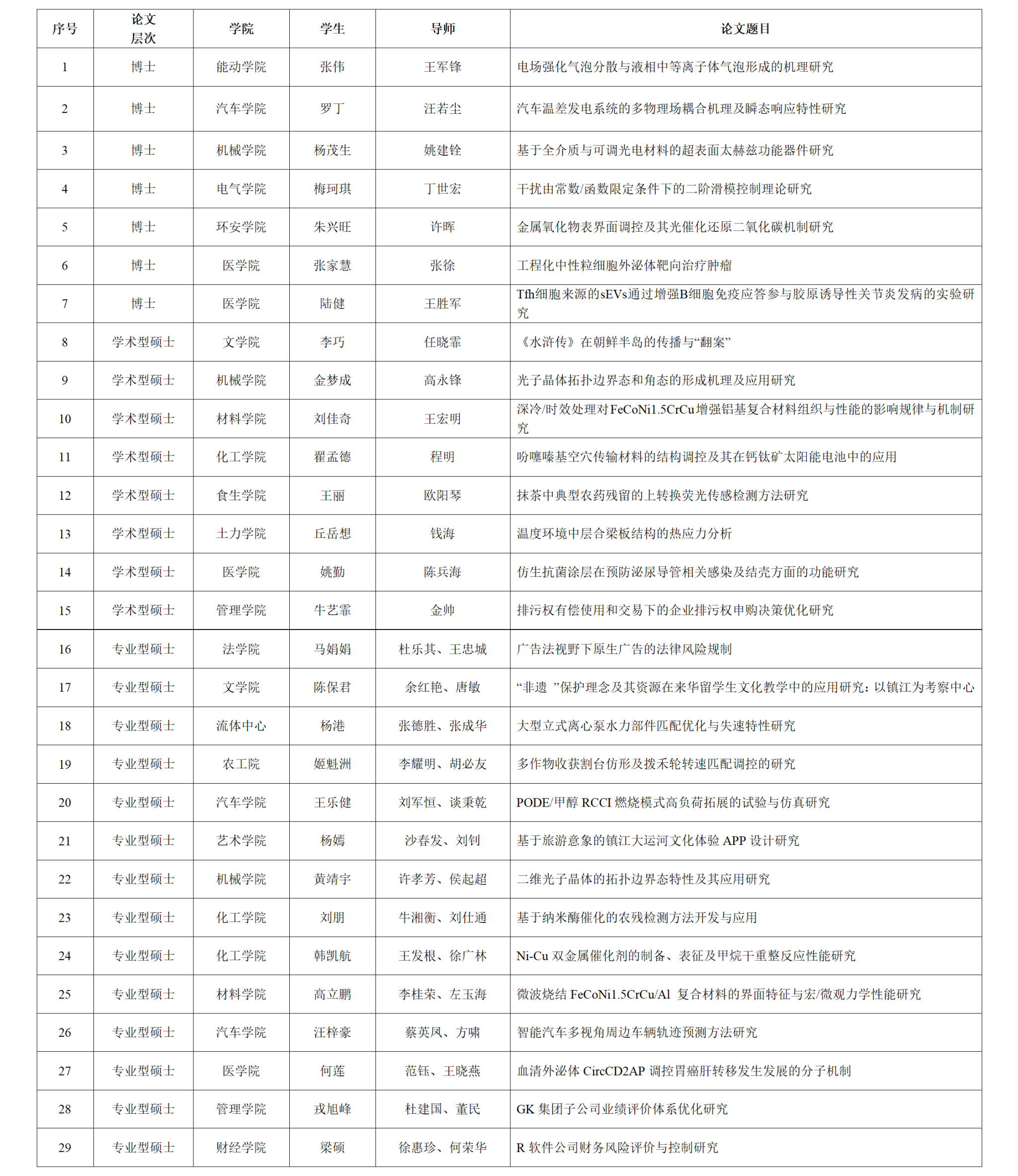 江蘇省優秀博士碩士學位論文經過學校初評推薦、省研究生教指委評審、省學位辦綜評及專家委員會審定等程序產生,旨在加強我省研究生教育質量保障體系和評選激勵機制建設,提高全省研究生學位論文質量和學位授予質量。