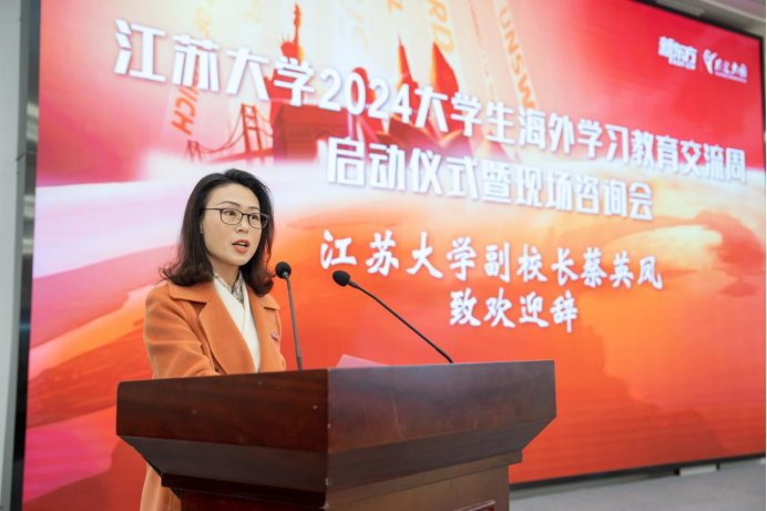 蔡英鳳致歡迎辭,表示海外學習教育交流周的舉辦是江蘇大學貫徹落實國家教育國際化戰略的重要舉措,也是學校提升人才培養質量、推動內涵式發展的重要途徑。蔡英鳳鼓勵廣大師生積極參與海外交流活動,不斷提升國際化素養和綜合能力。
