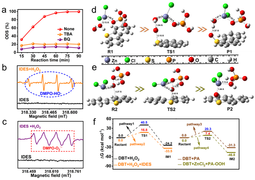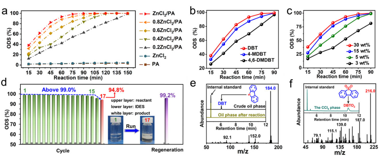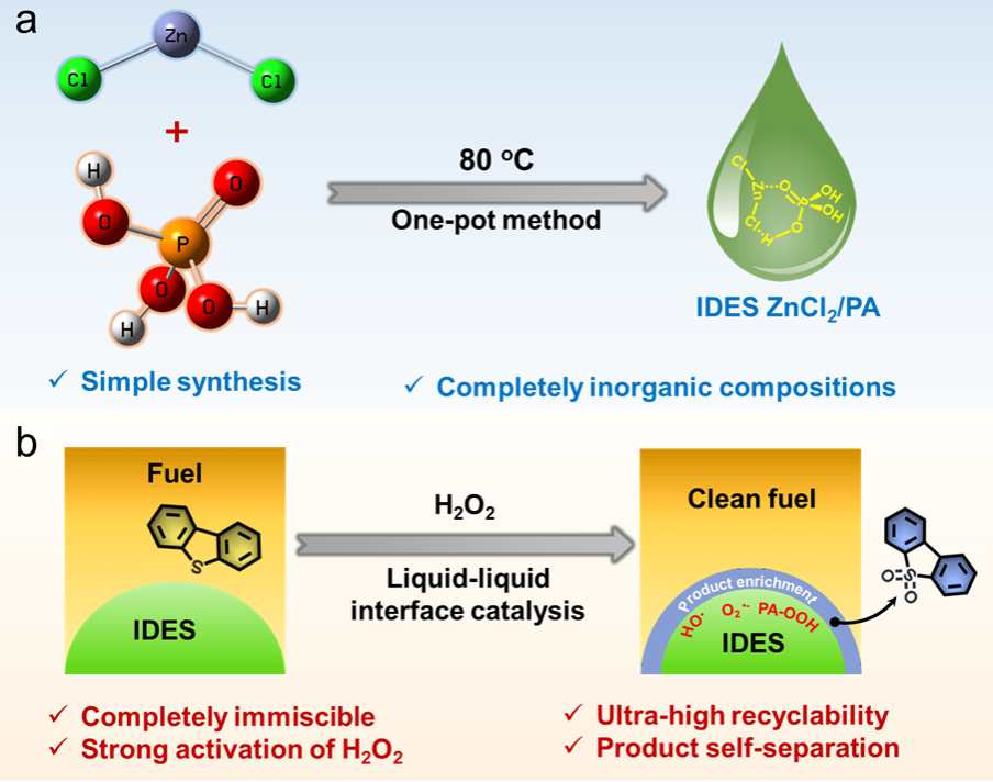 本工作以氯化鋅(ZnCl2)和磷酸(PA)為前驅體,通過氫鍵(Cl···H-O)和配位(Zn···O=P)構建了純無機低共熔溶劑(IDES-ZnCl2/PA),首次實現了產物自分離的高效液-液界面催化燃油超深度氧化脫硫。