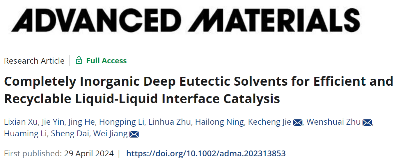 近日,我校能源研究院蔣偉副研究員團隊在化學與材料領域頂級期刊《先進材料》(Advanced Materials)上在線發表研究論文“Completely Inorganic Deep Eutectic Solvents for Efficient and Recyclable Liquid-Liquid Interface Catalysis”。江蘇大學為第一完成單位,能源研究院博士研究生徐麗仙為第一作者,蔣偉、南京大學揭克誠教授與江蘇大學朱文帥教授為共同通訊作者。