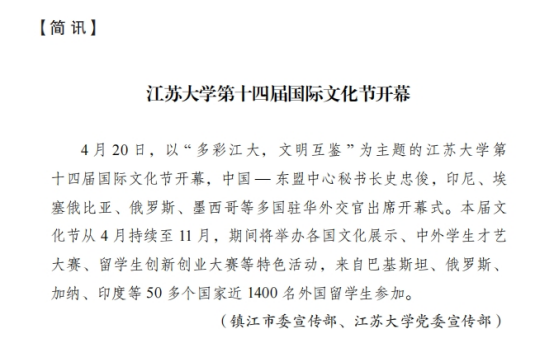 近日,江蘇省人民政府新聞辦公室印發的2024年第2期《江蘇外宣動態》,刊發簡訊,點贊我校第十四屆國際文化節開幕盛況。
