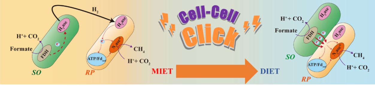 不同種屬細菌細胞之間的電子傳遞過程是近年來國際上新發現的微生物能量代謝過程,直接種間電子轉移(DIET)是其中最重要的一種細胞間電子傳遞模式。DIET對于維持微生物群落功能、驅動地球元素循環和污染物轉化至關重要,已成為環境和地學領域研究的國際前沿。但是,DIET如何發生及如何調控一直是困擾這一領域懸而未決的關鍵基礎科學難題。