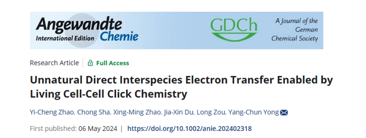近日,我校雍陽春團隊在《德國應用化學》(Angewandte Chemie International Edition )雜志上發表題為“Unnatural Direct Interspecies Electron Transfer Enabled by Living Cell-Cell Click Chemistry”的最新研究成果。江蘇大學為第一完成單位和唯一通訊單位,能源研究院/生物質能源研究院雍陽春為唯一通訊作者,環境與安全工程學院/生物質能源研究院碩士研究生趙逸城、教師沙沖為共同第一作者。