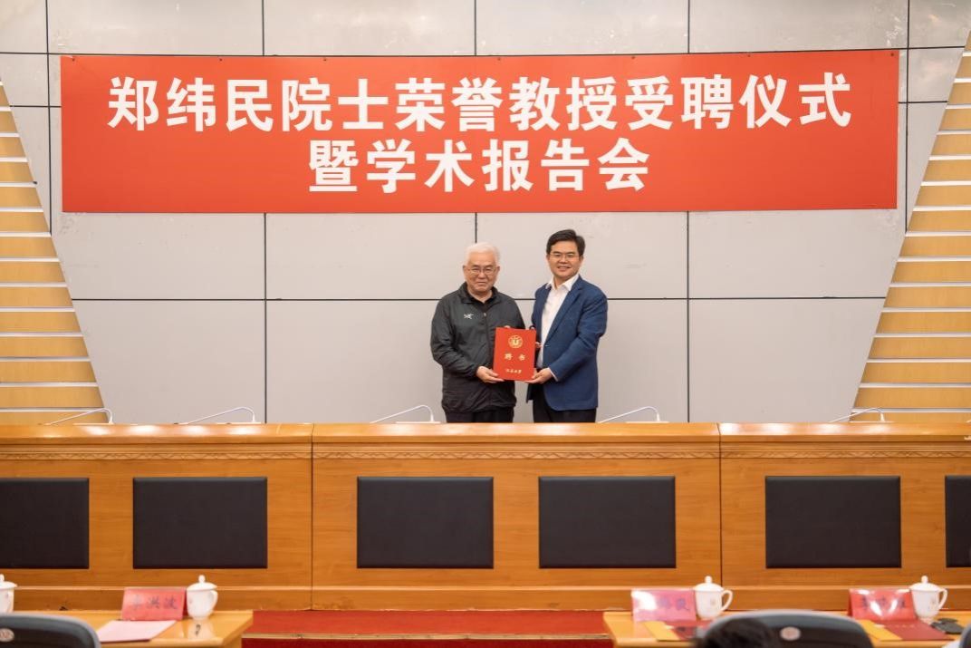 受聘儀式上,李洪波為鄭緯民和李曉維頒發(fā)了江蘇大學榮譽教授證書,為穆建芝頒發(fā)了江蘇大學產(chǎn)業(yè)教授證書。