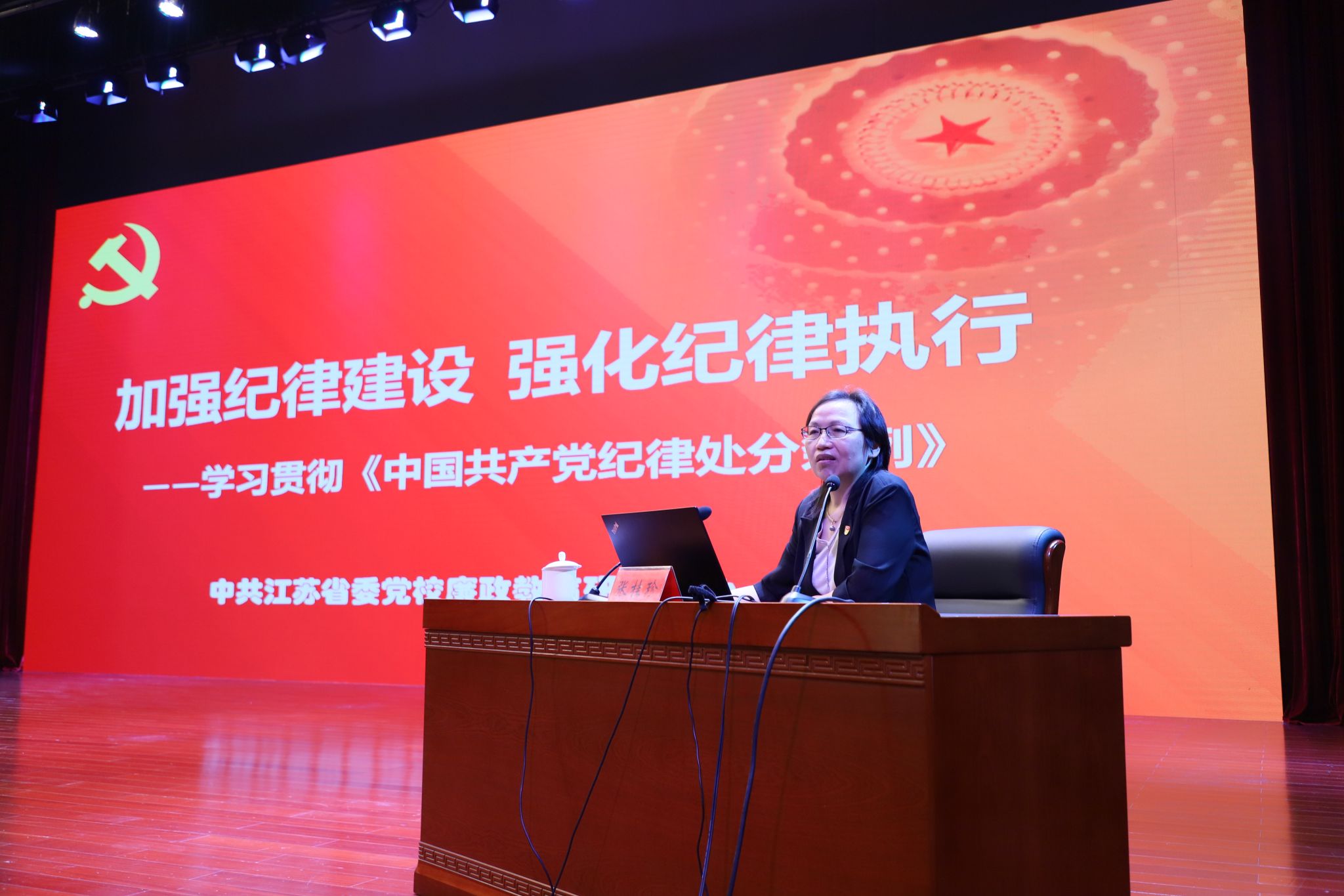 為認真學習貫徹《中國共產黨紀律處分條例》(以下簡稱《條例》),不斷深化對黨的紀律建設總體要求的理解,切實增強遵規守紀的思想自覺和行動自覺,不斷將黨紀學習教育引向深入,5月23日下午,學校在小禮堂舉辦黨紀學習教育專題輔導報告會,中共江蘇省委黨校廉政教育研究中心主任張桂珍教授作專題輔導報告。全體在校校領導、黨委常委,全體中層干部以及師生黨員代表聆聽了報告。報告會由校黨委書記李洪波主持。