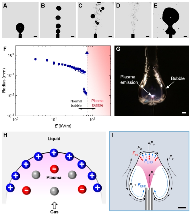 當流體受到電場作用時,由于帶電粒子與流體界面之間的耦合作用,其流動現象與傳統流體相比具有其獨特的特征。本研究首次報道了強電場作用下荷電液-氣多相流系統中氣泡從微觀到宏觀的跨尺度轉變過程。這一現象源于帶電粒子與中性粒子之間的相互作用,由此產生的等離子體氣泡以及電離氣體與液體之間的界面現象對流體動力學特性和界面穩定性具有重要影響,突破了傳統的以氣-液-固三態混合物為研究對象的多相流體系,涉及豐富的多相流前沿科學問題和理論創新。