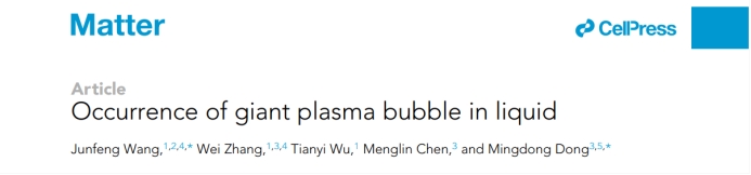 我校能源與動力工程學院王軍鋒教授團隊與丹麥奧胡斯大學跨學科納米科學中心董明東教授團隊合作,在Cell出版社國際頂刊《物質》(Matter)上發表了題為“Occurrence of giant plasma bubble in liquid”的最新研究成果,并被推薦為期刊封面論文。王軍鋒是第一作者兼通訊作者,董明東是共同通訊作者,張偉博士后是共同第一作者。