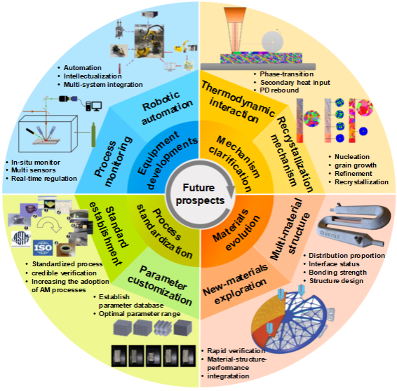 論文全面梳理了基于性能控制的復合增材制造技術在殘余應力拉-壓轉換、冶金缺陷閉合、微觀結構調控、力學性能改善和各向異性優化的原理,總結了熔池-能量場耦合及熱-力交互過程中晶粒形核、生長、再結晶過程。最后,對復合增材制造技術在多能場制造、新材料開發、裝備自動化和加工標準制定等方面面臨的挑戰和發展趨勢進行了分析和展望。復合增材制造技術為極端服役環境下復雜精細構件高性能、高壽命、以及高可靠性一體化制造提供了一種全新的途徑。
