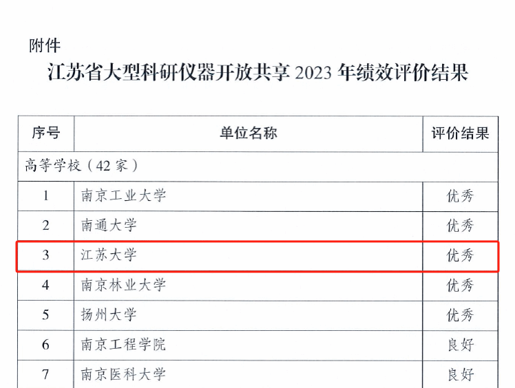 近日,江蘇省科技資源統籌服務中心發文,公布2023年江蘇省重大科研基礎設施和大型科研儀器開放服務績效評價結果。我校連續四年獲評優秀等次。