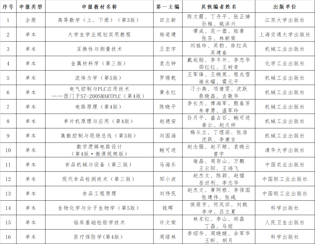 本次推薦遴選,江蘇大學共獲得推薦16本教材。