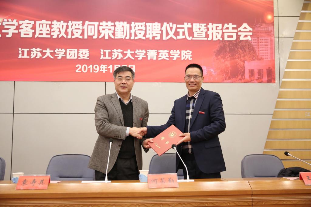 1月5日,江蘇大學(xué)客座教授何榮勤受聘儀式暨學(xué)術(shù)報(bào)告會(huì)在會(huì)議中心第一報(bào)告廳舉行。校黨委書記袁壽其出席,并為何榮勤教授佩戴校徽并頒發(fā)聘書。受聘儀式由副校長張濟(jì)建主持,校團(tuán)委全體工作人員、菁英學(xué)院學(xué)員、第二期大骨班學(xué)員以及部分校、院學(xué)生干部參加儀式。