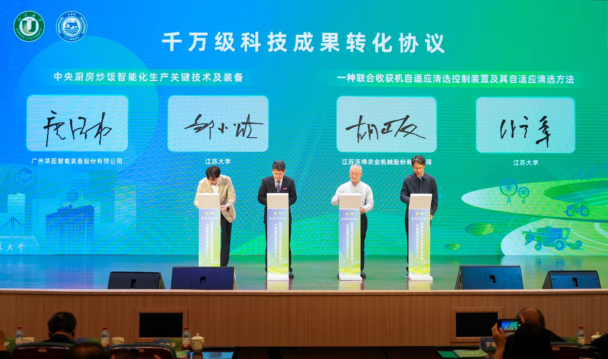 開幕式上,2項千萬級農業裝備成果簽約轉讓。副校長鄒小波與廣州萊因智能裝備股份有限公司董事長唐德權簽署風味量化及自動分裝系統成果轉讓協議;智能農機裝備理論與技術重點實驗室黨委書記、主任徐立章與江蘇沃得農業機械股份有限公司副總經理胡必友簽署聯合收獲機脫粒清選自適應控制系統成果轉讓協議。