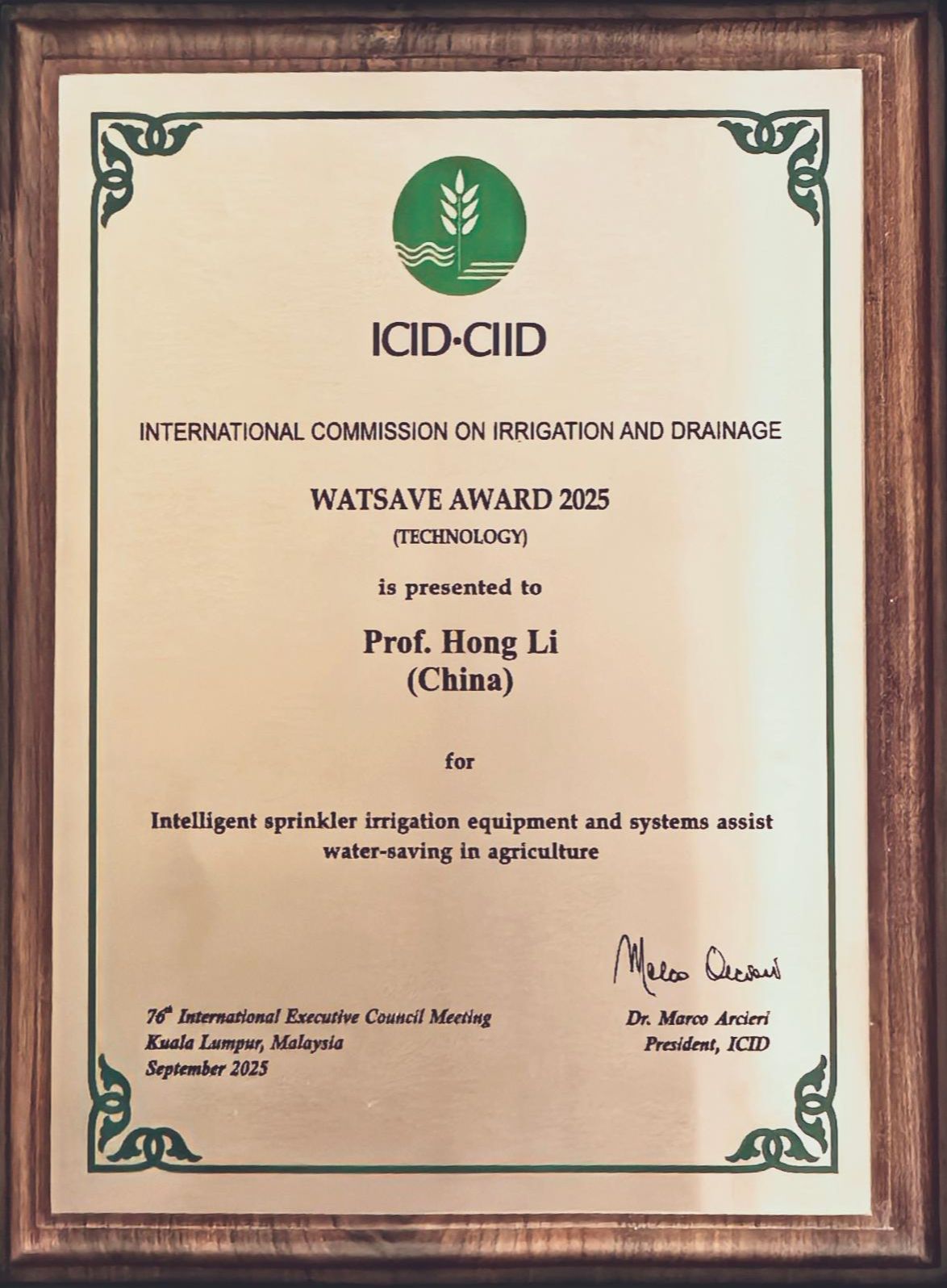 李紅長期致力于節水灌溉裝備與技術的創新研究,在低壓噴灌技術及低壓均勻噴灑噴頭、變量噴灑噴頭、水肥混施裝置等的原創研發以及新型卷盤式噴灌機組等節水灌溉裝備研制上做出了創新貢獻。基于作物水肥需求信息的農田灌排智能管控系統、新一代灌溉機組及裝備已廣泛應用于我國大田稻麥、丘陵茶園等灌溉施肥的田間管理,顯著提升了我國節水灌溉的技術水平和應用效能。此次獲獎不僅體現了個人的學術影響力,也標志著中國在節水灌溉技術研發與應用領域的國際領先地位得到進一步認可。