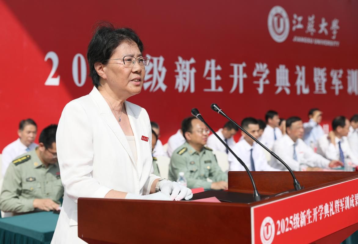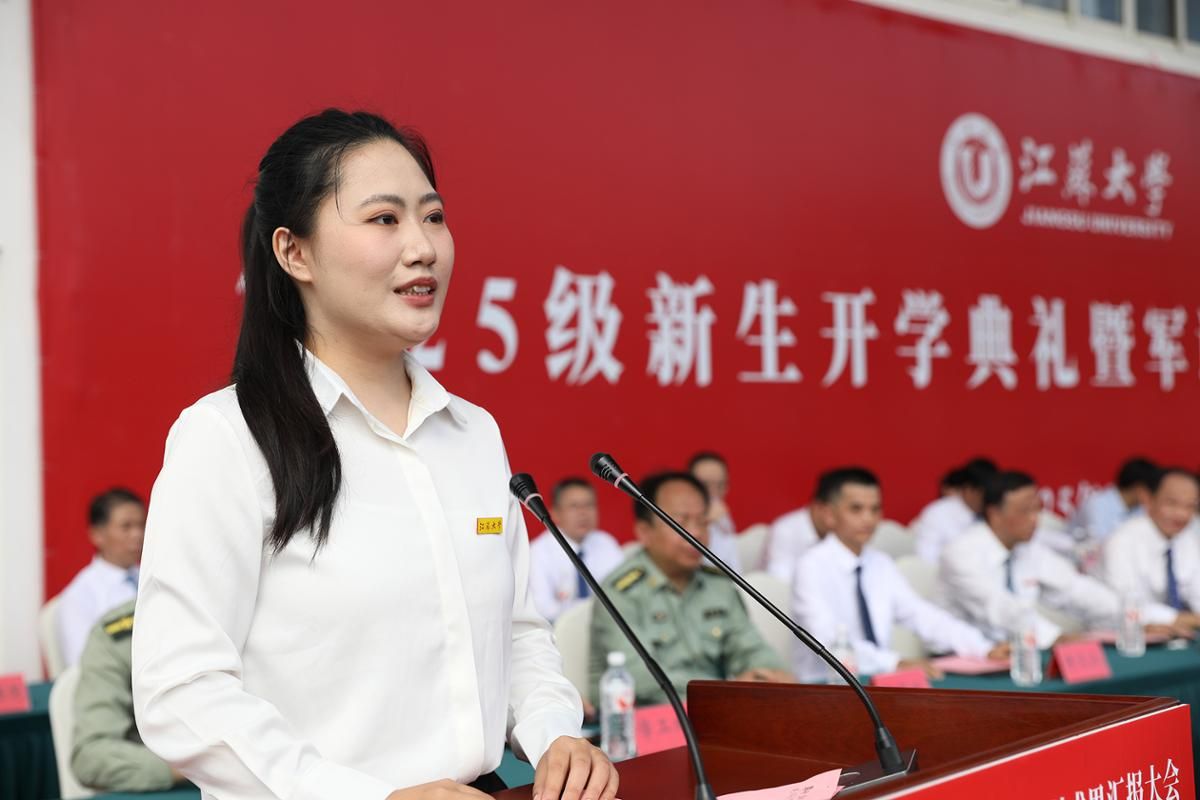 校長邢衛紅在典禮上發表題為《展卷江大 閱見未來》的講話。邢衛紅說,同學們與江大的故事已正式開啟,連日來的軍訓,見證了大家的成長蛻變,是同學們執筆展卷書寫江大生活的第一頁精彩。邢衛紅說,江大是一本“書”,這本書是一部底蘊深厚的書、一部特色鮮明的書、一部鐫刻奮斗的書,需要同學們靜心閱讀、用心體悟、用行動注解,如何書寫好這本書的下一頁,答案就在“博學、求是、明德”校訓里。邢衛紅寄語新生廣讀“有字之書”、常讀“無字之書”、寫好“人生之書”,希望同學們盡情地去翻閱、去思考、去書寫“江大之書”,用奮斗與成長續寫嶄新的篇章。她祝愿大家在江大學有所成、思有所得,度過無悔的青春歲月,成就更好的自己。