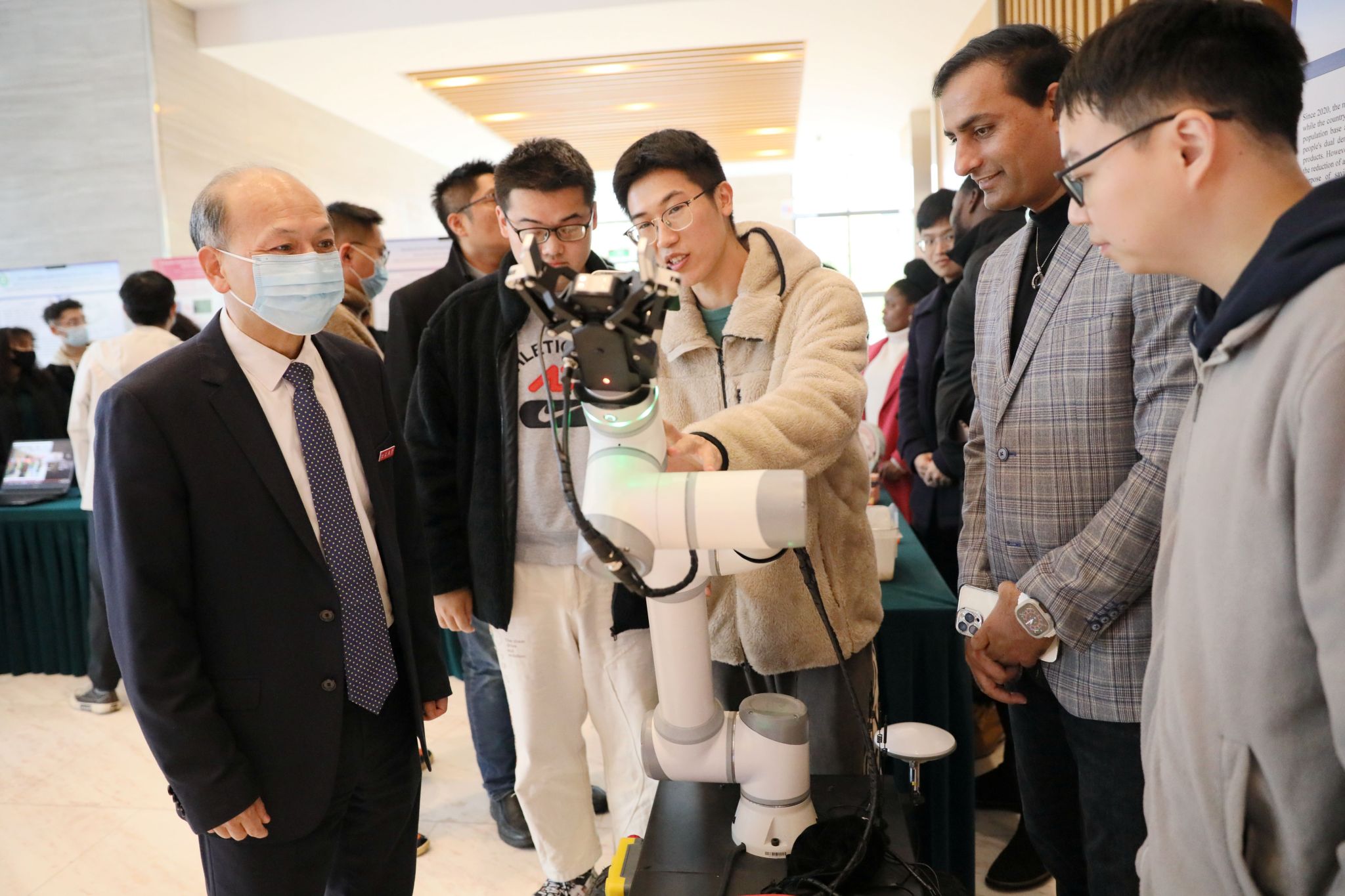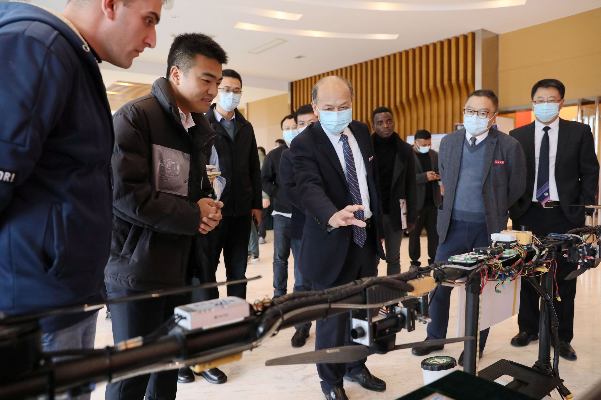 開幕式前,與會領(lǐng)導(dǎo)參觀了中外研究生同室創(chuàng)新的最新研究成果。(研究生院)
