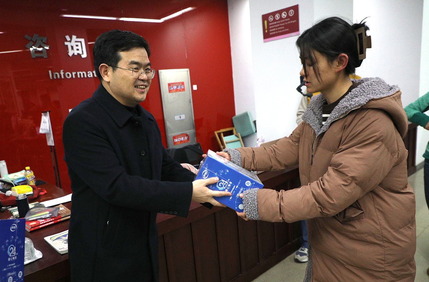 12月7日晚,校長顏曉紅、校黨委副書記李洪波一行走進圖書館,看望慰問考研學生。