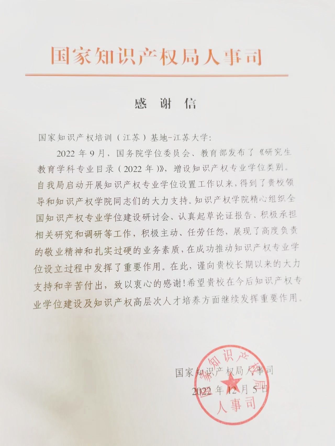國家知識產權局人事司致學校感謝信