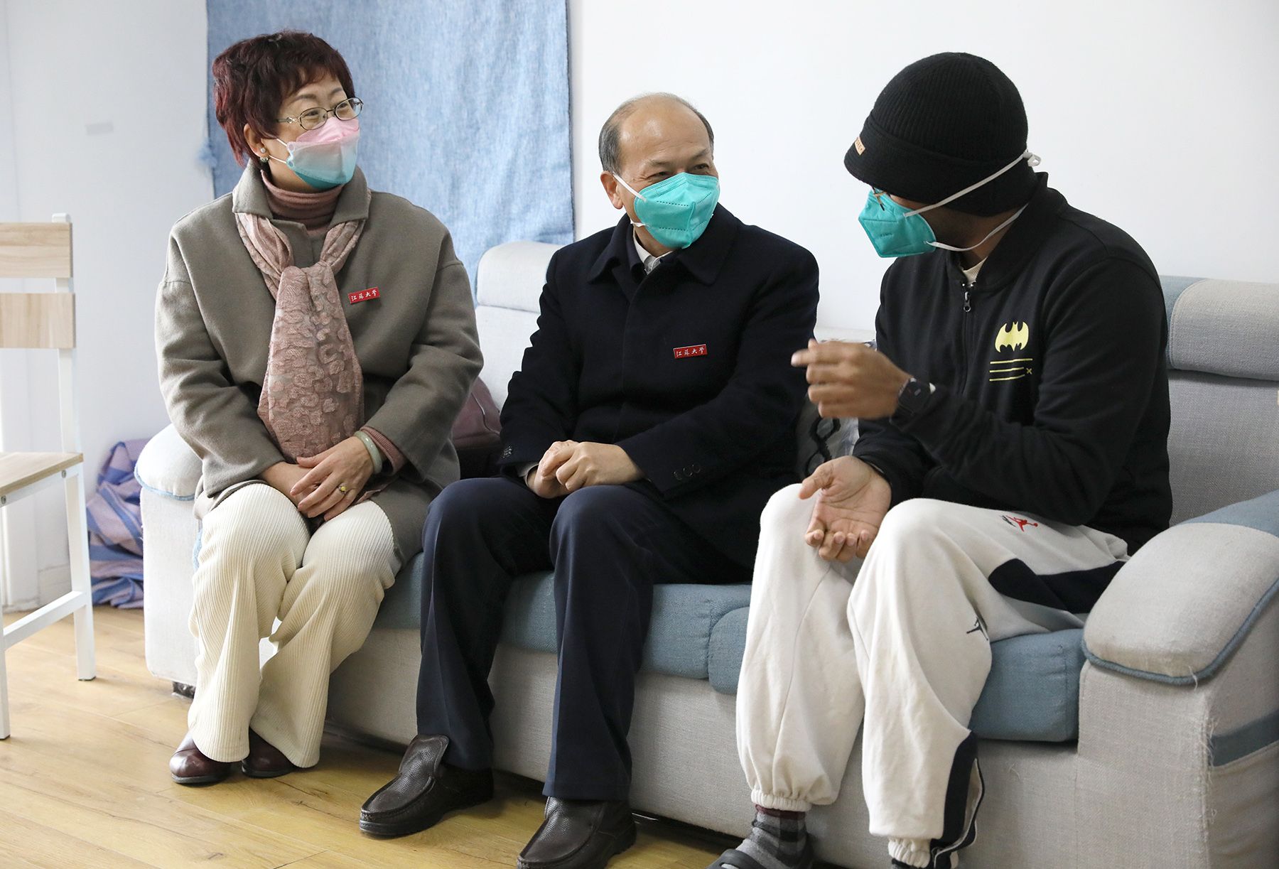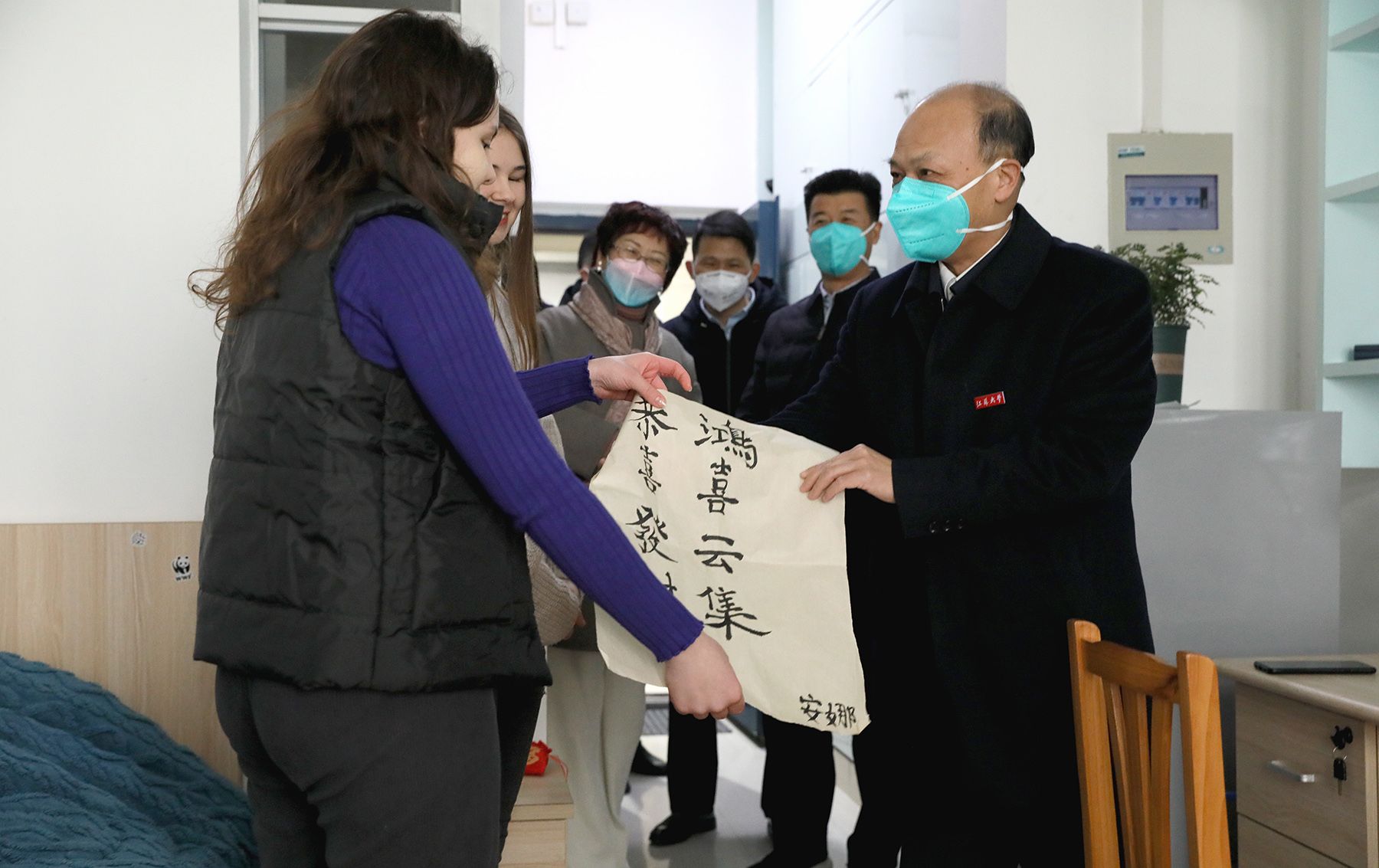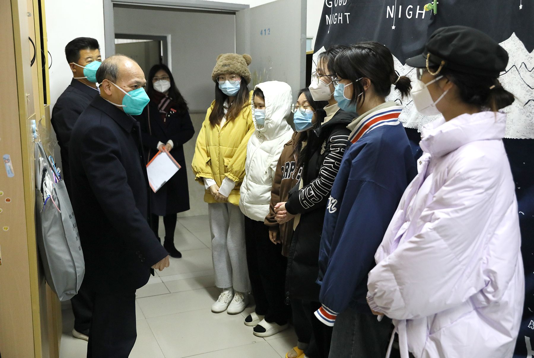 走訪中,顏曉紅與同學們親切交談,詳細了解同學們在學習、就餐、住宿、生活需求等各方面情況,關心留校學生的健康、學習和生活狀況。顏曉紅叮囑同學們當好自身健康的第一責任人,做好個人防護,相互關心幫助;希望同學們能夠充分利用寒假留校時間加強學習,提升自我,架好中外友誼橋梁;預祝同學們在教師資格證面試和實驗成果等方面取得優異成績。