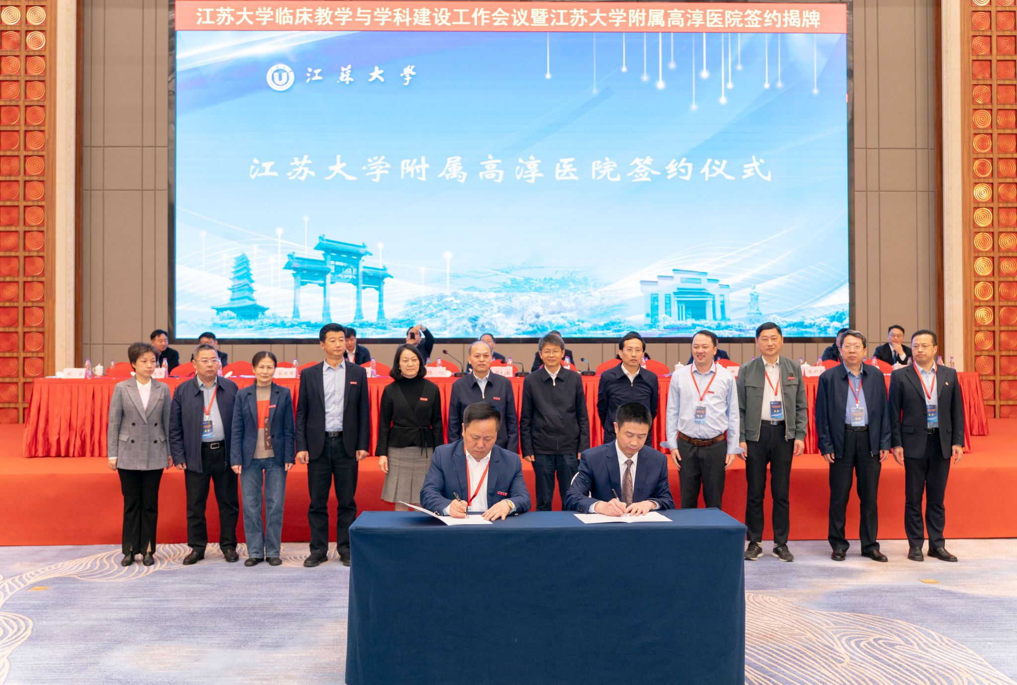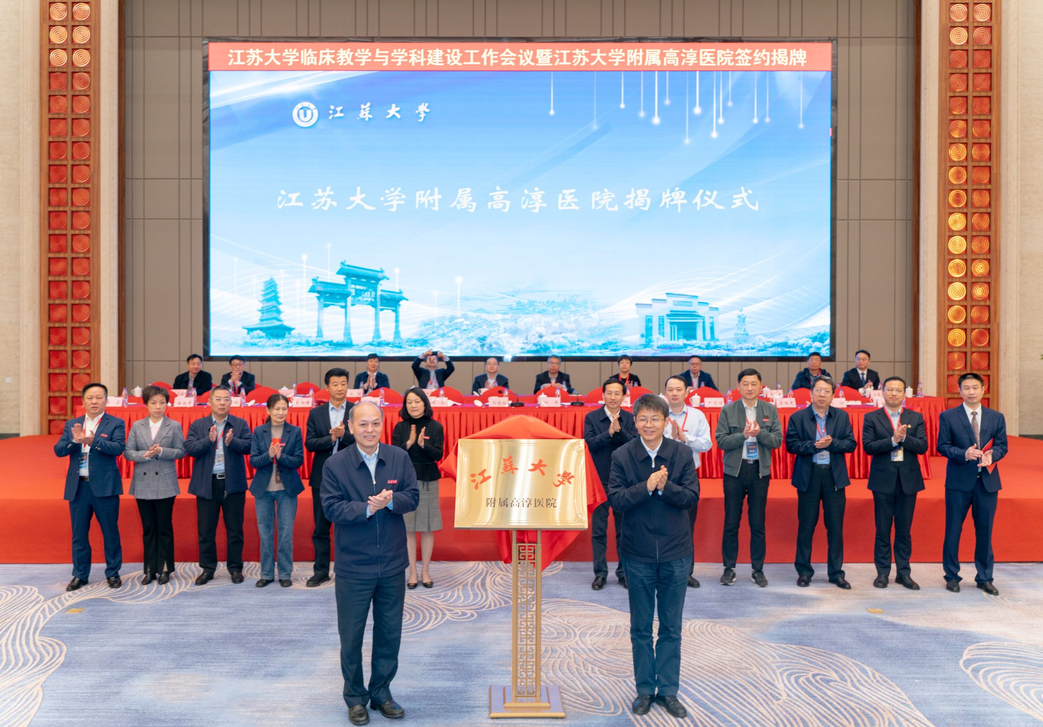 儀式上,顏曉紅、劉偉共同為江蘇大學附屬高淳醫院揭牌,我校醫學部常務副主任殷朝峰和南京市高淳人民醫院黨委書記王東明簽署正式合作協議。南京市高淳人民醫院院長高玉華作表態發言。會上,醫學部作《厚積真功 創新突破 奮力開創臨床教學與學科建設新局面》工作報告。