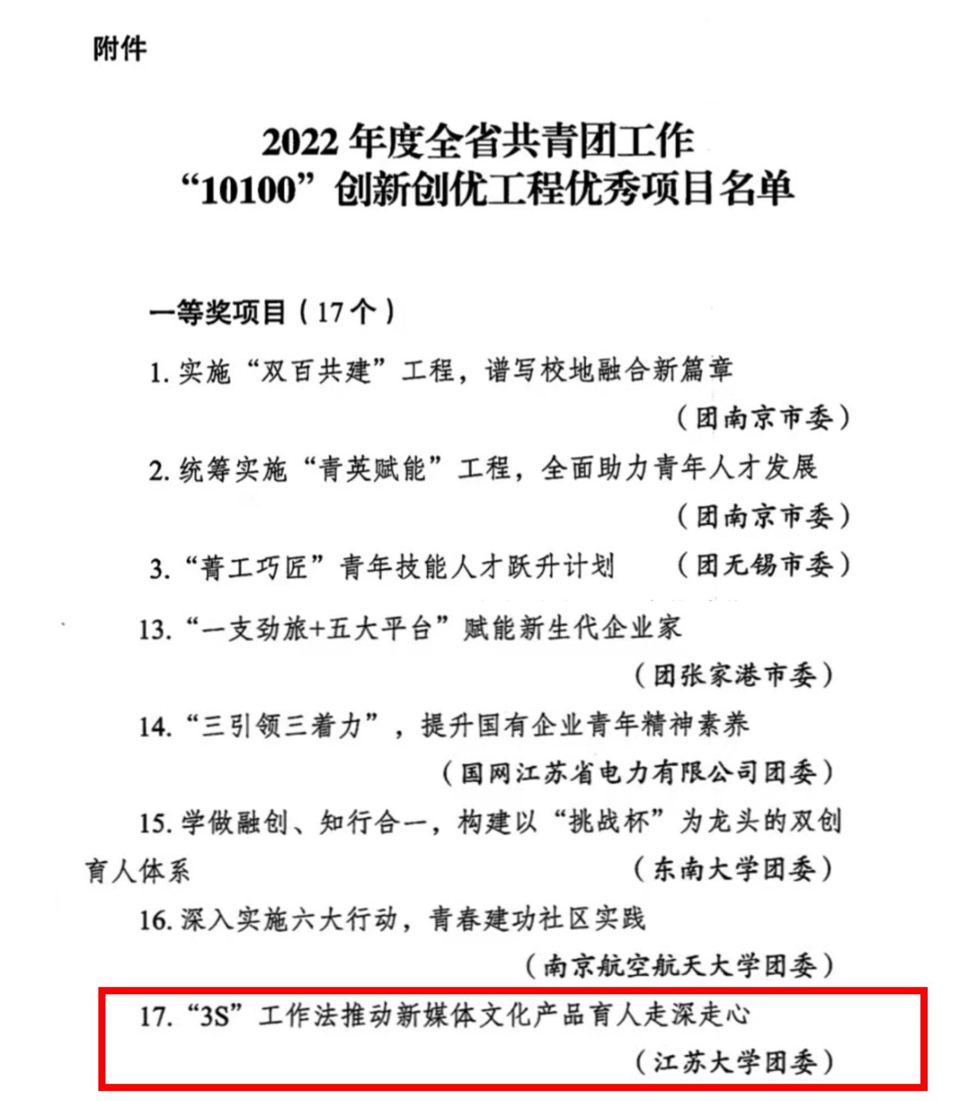 近日,團(tuán)省委發(fā)布《關(guān)于公布2022年度全省共青團(tuán)工作“10100”創(chuàng)新創(chuàng)優(yōu)工程優(yōu)秀項(xiàng)目評(píng)選結(jié)果的通知》,全省共評(píng)選一等獎(jiǎng)17項(xiàng),其中高校3項(xiàng)。我校《“3S”工作法推動(dòng)新媒體文化產(chǎn)品育人走深走心》項(xiàng)目榮獲一等獎(jiǎng),省屬高校唯一。