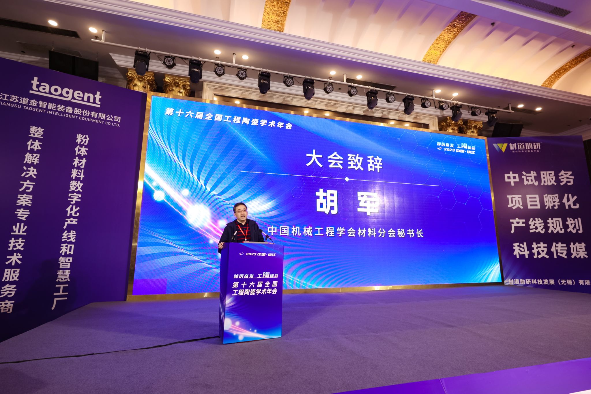 本次年會由中國機械工程學會材料分會、江蘇大學、江蘇省硅酸鹽學會聯合主辦,材道助研科技發展(無錫)有限公司承辦。4月15日,中國工程院院士、上海硅酸鹽研究所教授董紹明,工程陶瓷專業委員會理事長肖漢寧、中國機械工程學會材料分會秘書長胡軍、中科院上海高等研究院院長黃政仁、我校副校長趙玉濤等出席開幕式,開幕式由我校材料學院院長喬冠軍主持。