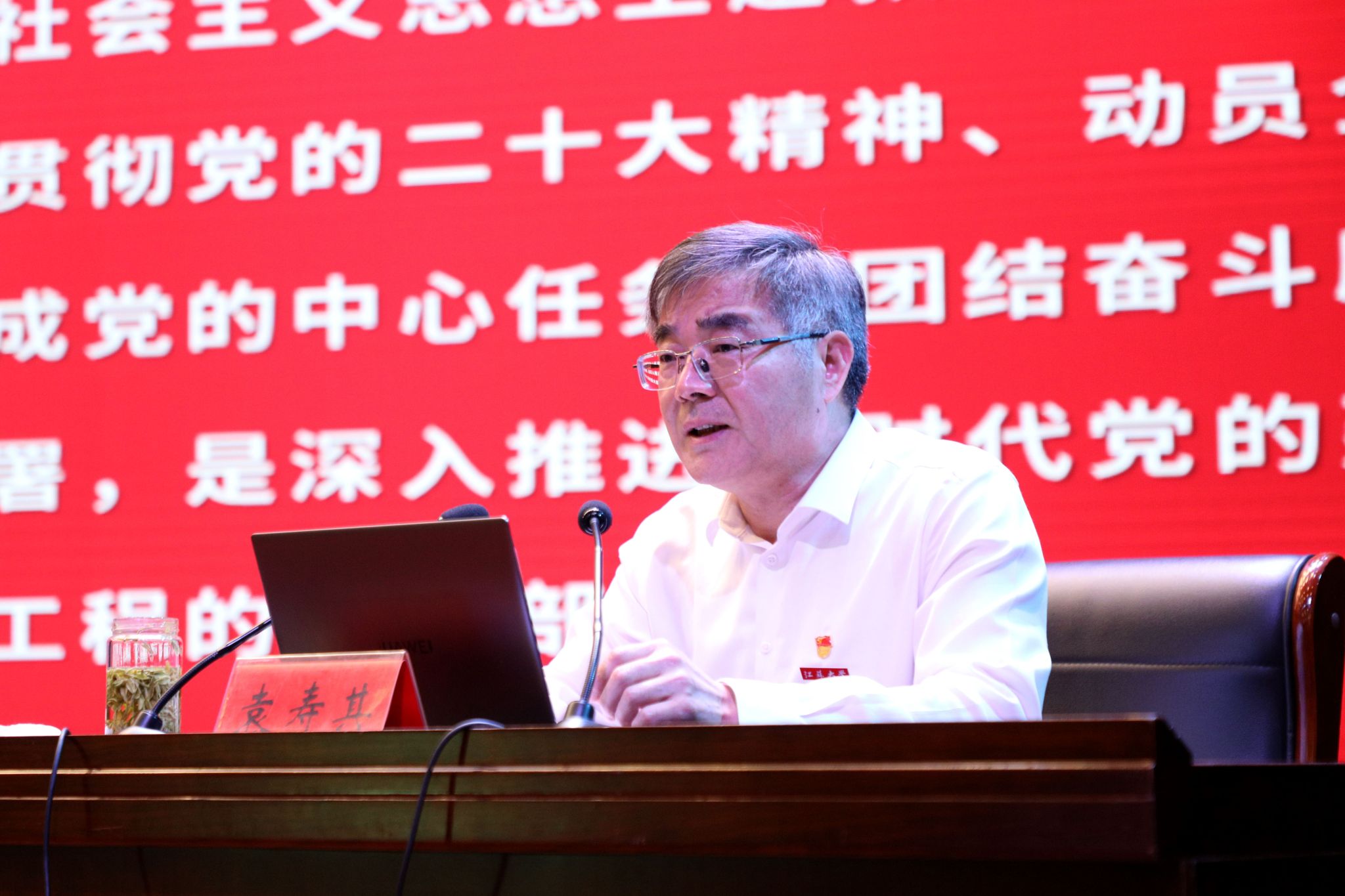 袁壽其結合個人理論學習的收獲體會和調查研究的階段性成果感悟,從“突出'三帶三入’,理論學習得到進一步強化;聚焦問題和難點,調查研究扎實有效深入開展;全面落實習近平總書記對學校重要批示精神,切實推動學校事業更高質量發展”三個方面上了一堂精彩生動的專題黨課。