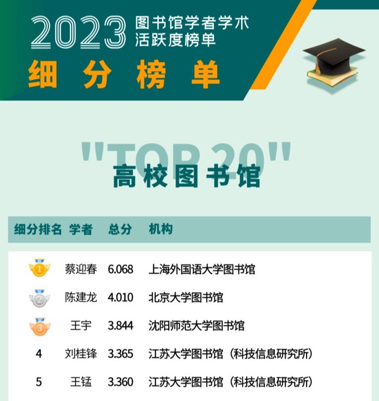 在發(fā)布的“2023圖書(shū)館學(xué)者學(xué)術(shù)活躍度榜”中,列出了2018年至2022年間在圖書(shū)情報(bào)領(lǐng)域中最具學(xué)術(shù)活躍度的學(xué)者。本次共統(tǒng)計(jì)4335位學(xué)者,上榜學(xué)者433位(前10%),并按分?jǐn)?shù)區(qū)間段分為五個(gè)等級(jí),其中,A類學(xué)者40人、B類學(xué)者113人、C類學(xué)者85人、D類學(xué)者115人、E類學(xué)者80人。我校圖書(shū)館劉桂鋒、王錳、蘇文成等11位館員上榜,其中A類2人,B類4人,C類3人,D類2人。(圖書(shū)館)