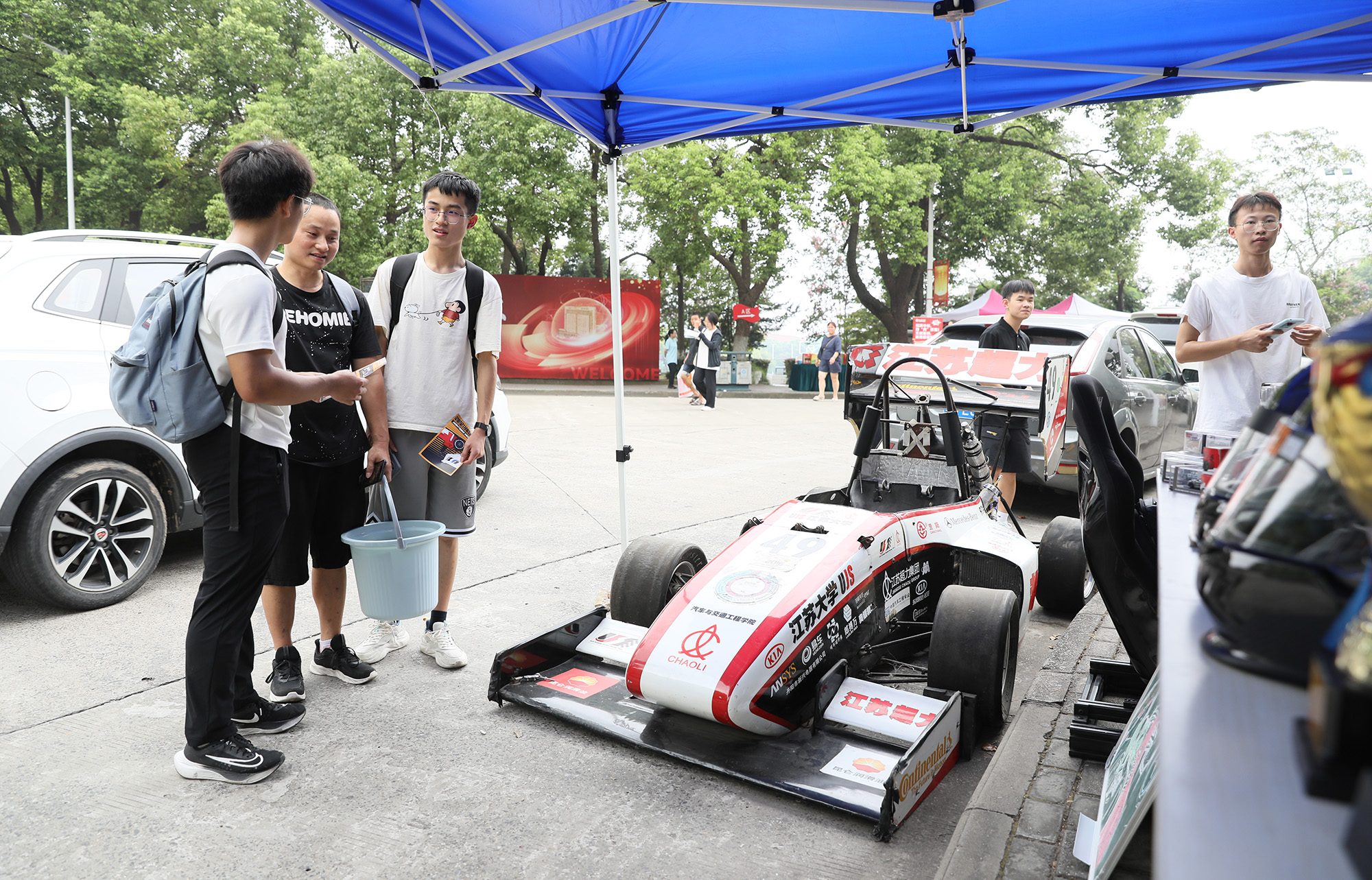除了無人駕駛小巴車,方程式賽車、舞蹈機器人、智能機械狗、3D打印等各學(xué)院的科技成果輪番上陣,不少新生和家長來到展示區(qū)打卡拍照。