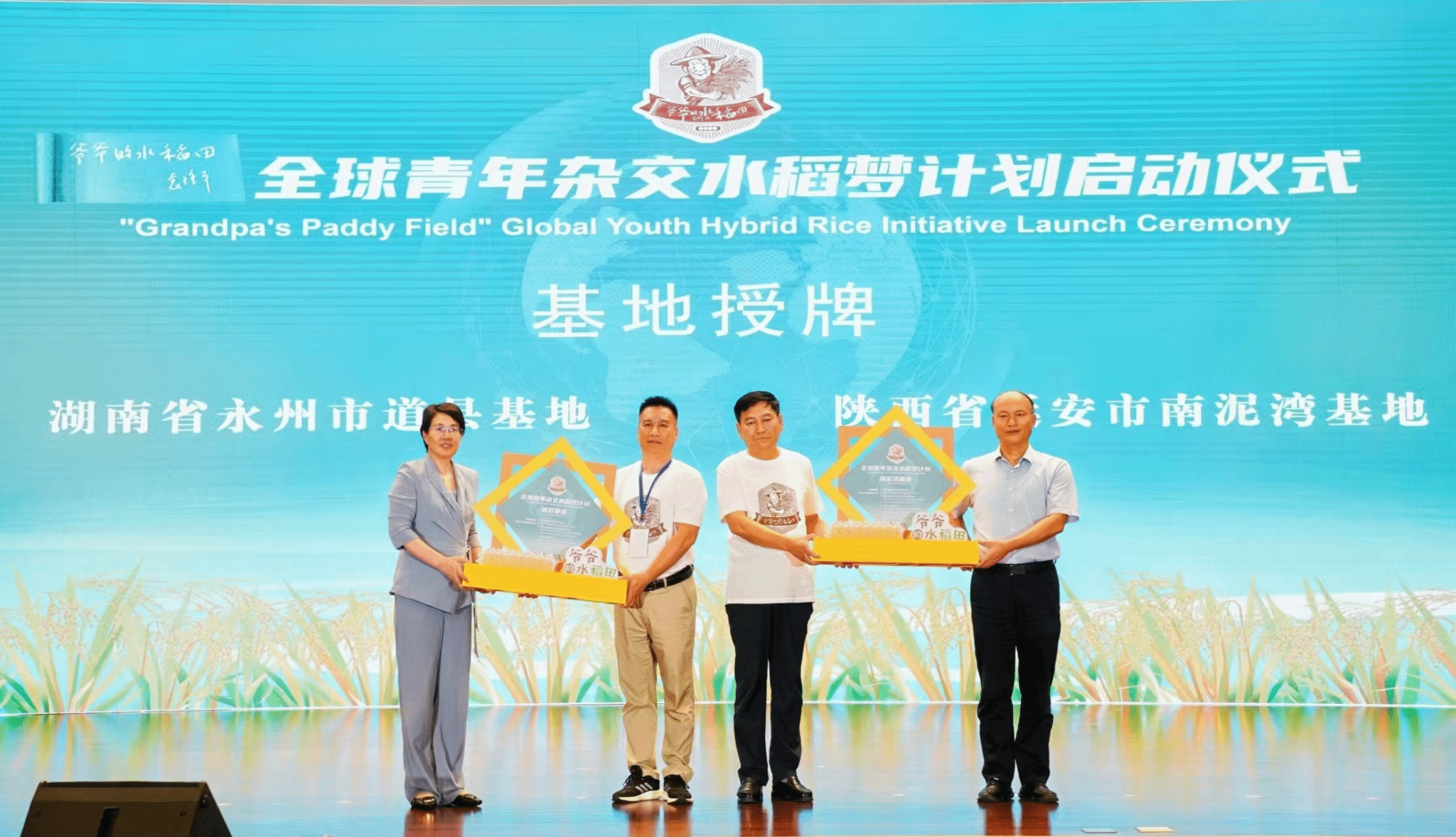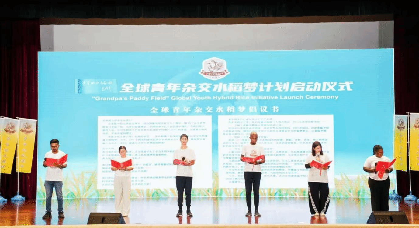 隨后,中外青年學(xué)生代表上臺(tái)宣讀《全球青年雜交水稻夢(mèng)倡議書(shū)》。倡議書(shū)提到,在袁隆平院士逝世四周年、聯(lián)合國(guó)糧農(nóng)組織成立八十周年、第四十五個(gè)世界糧食日來(lái)臨之際,全球仍有6億人在饑餓中掙扎,而雜交水稻技術(shù)已在非洲大地創(chuàng)造平均增產(chǎn)20%的奇跡。195個(gè)國(guó)家的青年代表與在華留學(xué)生將成為袁隆平院士 “禾下乘涼” 與 “雜交水稻覆蓋全球” 兩個(gè)未竟夢(mèng)想的接棒者。他們將在道縣和南泥灣扎下雜交水稻夢(mèng)的根,把袁爺爺 “要做一粒好種子” 的誓言嵌進(jìn)智慧試驗(yàn)田的基因,讓稻田變身藝術(shù)畫(huà)布講述糧食安全的故事,并重點(diǎn)構(gòu)建《袁隆平精神全球青年巡講計(jì)劃》《人類豐收藝術(shù)年鑒》《全球青年水稻創(chuàng)新報(bào)告》三大特色板塊,以青春之力為人類反饑餓事業(yè)貢獻(xiàn)力量。