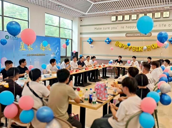 學校食堂內彩色氣球點綴,處處洋溢著溫馨的氛圍。學長學姐們手持“新程燦爛,生日快樂”“江大等你,未來可期”的祝福牌,微笑陪伴在新生身旁,瞬間拉近了彼此的距離。