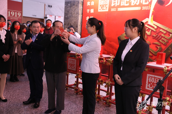 開幕式上,還舉行了本次展覽主題印章遞交傳遞儀式。一枚用鋼水澆鑄而成,印坯通體鑄有“海水江崖紋”,采用黨旗紅、黨徽金配色寓意中國共產黨人鋼鐵般堅強的革命意志和沉甸甸的歷史使命與擔當的“印記初心”主題印章,在近60年黨齡的90歲退休教師楊光元、管理學院黨委書記王麗敏、材料科學與工程學院研究生張瑜的手中依次轉遞,象征著全體老中青黨員接續傳承中國共產黨人的初心使命和奮斗精神。