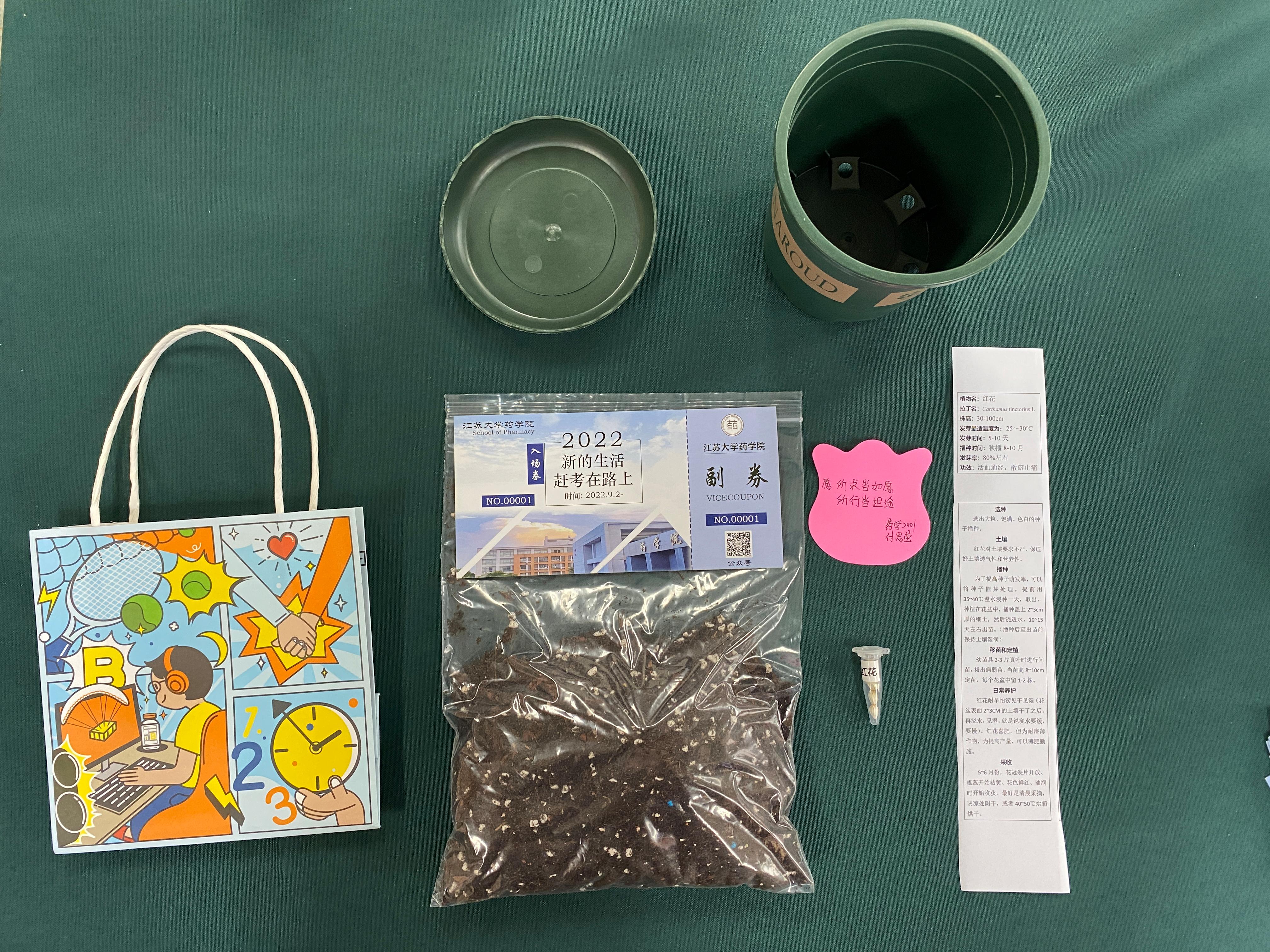 “送你一顆藥用種子,微黍般輕小的胚囊,蓄藏生命最蓬勃的力量......”9月4日晚,在江蘇大學藥學院本科生新生宿舍,首批完成報到手續的157名新生都獲贈學院領導老師親手送上的一份特殊開學禮:4粒中藥材紅花種子、一包營養土、一個花盆、一份種植攻略以及一張師長親筆寫的祝福便簽。