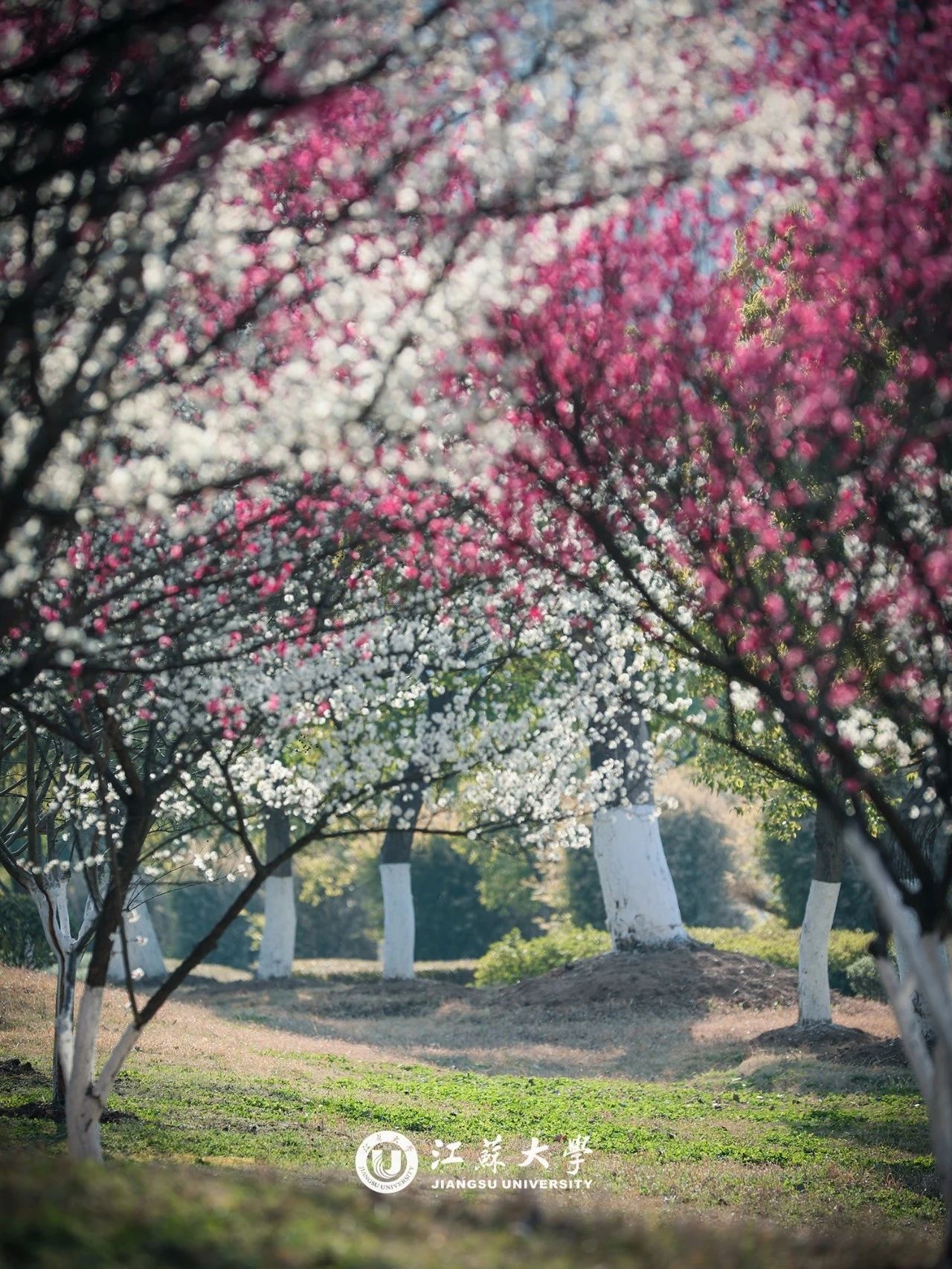 2月至3月,是江大梅園的最佳觀賞期。占地25000平方米的梅園內(nèi),白梅、綠萼、美人梅、朱砂梅、宮粉等20余個品種的梅花競相綻放,上千株梅花或艷如朝霞,或白似瑞雪,令師生流連忘返,并吸引不少社會人員前來“打卡”。3月8日當天,學(xué)校還在梅園舉辦走秀活動,邀全校女教工和女大學(xué)生們在梅園中以“紅毯秀”的形式與芬芳梅花美麗邂逅。值得一提的是,這片建于2010年梅園,除了梅花,還種有其他觀葉觀花類植物,如迎春、香櫞、紅花檵木、紅葉石楠、紫薇、茶梅、山茶、紫藤等,觀賞效果極佳。