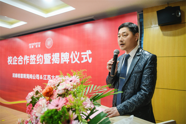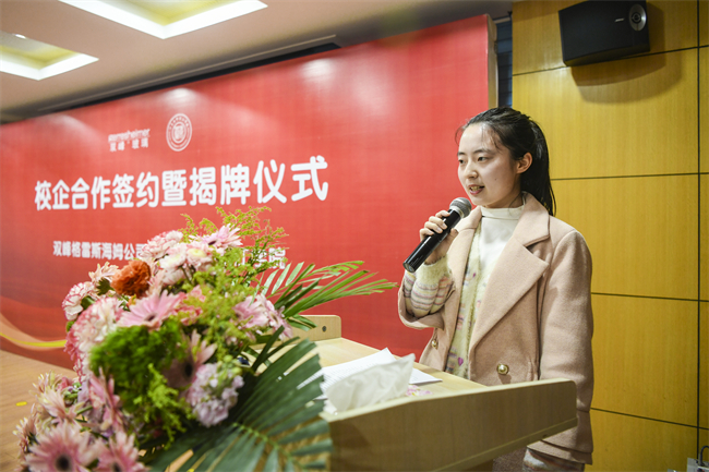 江蘇大學京江學院2022屆畢業生雙峰格雷斯海姆銷售部國際業務市場服務員戴詩瑩作為校企合作就業代表發表履職感言。