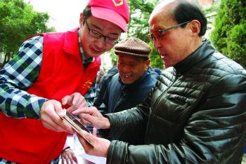 3月4日,江蘇大學志愿者走進鎮江市潤州區和平路街道桃一社區,開展“雷鋒街”創建10年紀念活動,進行多種形式的便民服務。圖為大學生志愿者在指導老年人正確使用智能手機。