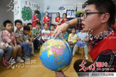 2014年6月26日,大學生(右)通過照片向孩子們介紹生態環境正面臨的危機。