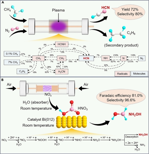 論文通過剖析美國特拉華大學和中國科學技術大學等研究團隊最新的研究進展(DOI: 10.1126/sciadv.adl4246;10.1038/s41893-024-01330-w),重點評述和展望了等離子體輔助轉化技術在可持續合成領域的應用潛力。文章介紹了等離子體技術如何在低溫條件下激發化學反應,從而克服傳統方法中的熱力學限制。這種技術不僅在能源效率和產物選擇性方面表現出色,還顯著減少了環境污染。研究發現在無需催化劑的情況下,利用等離子體技術可直接將氮氣和甲烷轉化為高價值化學品。該方法相較于傳統的工業工藝具有明顯的優勢:在更低的溫度下實現了更高的選擇性和產率,能耗顯著降低,并極大地減少了二氧化碳排放,展示出綠色合成的巨大潛力。此外,文章詳細介紹了等離子體與催化技術耦合的可能性,探討了這類組合如何進一步提高目標產物的選擇性和能量利用率。研究指出,將等離子體技術與電化學工藝相結合,僅以空氣和水作為反應物,以電能為驅動力,在常溫常壓條件下實現了羥胺的綠色、低碳、可持續合成。