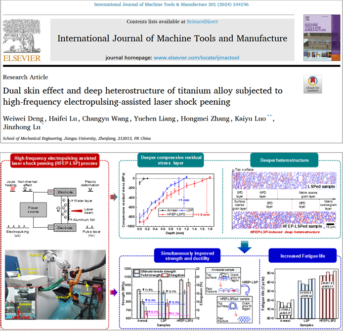 近日,我校機械工程學(xué)院魯金忠教授團隊在機械制造領(lǐng)域頂刊《國際機床與制造雜志》(International Journal of Machine Tools and Manufacture)上發(fā)表了題為“Dual skin effect and deep heterostructure of titanium alloy subjected to high-frequency electropulsing-assisted laser shock peening”的研究論文。該研究成果提出了一種新型高頻電脈沖輔助激光沖擊深度強化技術(shù)(HFEP-LSP),實現(xiàn)強韌性的協(xié)同提升和疲勞壽命的大幅度增長。機械工程學(xué)院博士生鄧維維為第一作者,魯金忠教授和羅開玉教授為共同通訊作者。